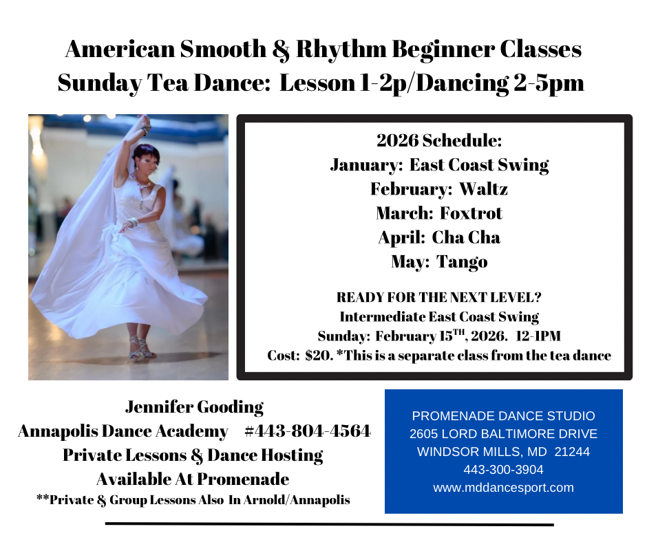 Not sure where to start? Annapolis Dance Academy can help you feel comfortable taking the floor and dancing the night away. Small group classes are great for those looking to develop social friendships while learning various dances. No partner or experience necessary. Develop friendships while exercising in a safe way for your body. Text Jennifer at 443-804-4564 for Availability & Upcoming Sessions.