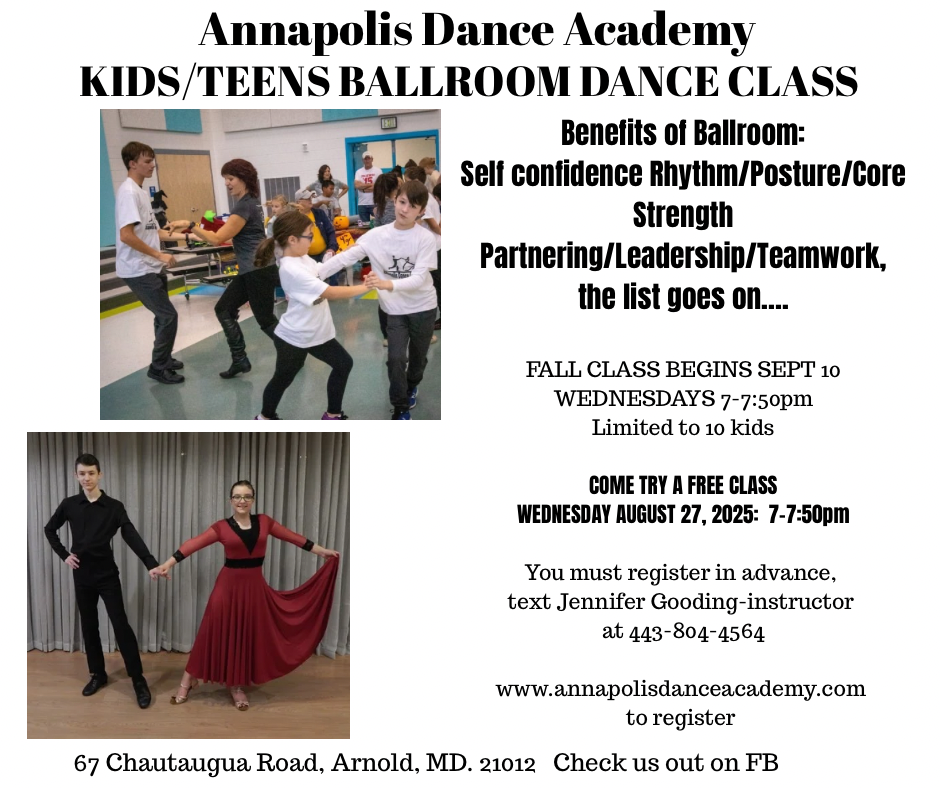 TO REGISTER FOR THIS CLASS: PLEASE CALL JENNIFER @ 410-757-8860 OR EMAIL @ annapolisdanceacademy@verizon.net.